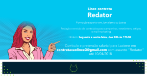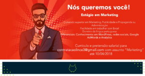 Vagas disponíveis: DIRETOR DE ARTE JR. PRODUTOR DE CONTEÚDO DESENVOLVEDOR WEB TESTER E SUPORTE Atenção, pois cada uma das